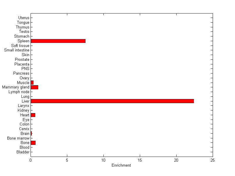 The expression level is normalized with tissue-library size. Each value for a gene in a tissue is a ratio of observed ESTs to the expected one in this tissue. The expected number of ESTs is the product of total ESTs of the gene and the fraction of total ESTs in the tissue among all ESTs in 30 tissues.