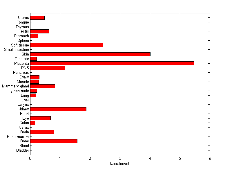 The expression level is normalized with tissue-library size. Each value for a gene in a tissue is a ratio of observed ESTs to the expected one in this tissue. The expected number of ESTs is the product of total ESTs of the gene and the fraction of total ESTs in the tissue among all ESTs in 30 tissues.