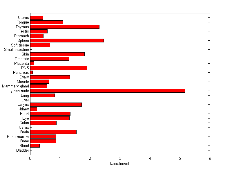 The expression level is normalized with tissue-library size. Each value for a gene in a tissue is a ratio of observed ESTs to the expected one in this tissue. The expected number of ESTs is the product of total ESTs of the gene and the fraction of total ESTs in the tissue among all ESTs in 30 tissues.