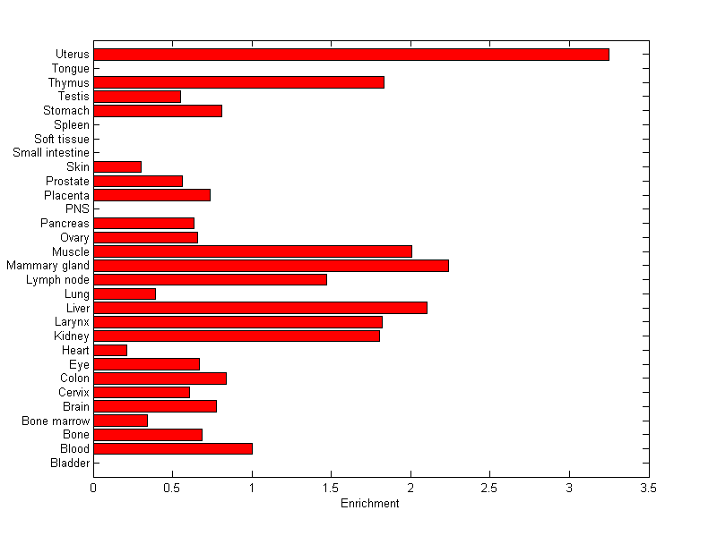 The expression level is normalized with tissue-library size. Each value for a gene in a tissue is a ratio of observed ESTs to the expected one in this tissue. The expected number of ESTs is the product of total ESTs of the gene and the fraction of total ESTs in the tissue among all ESTs in 30 tissues.