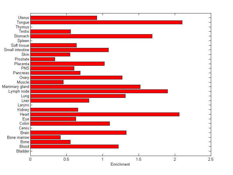 The expression level is normalized with tissue-library size. Each value for a gene in a tissue is a ratio of observed ESTs to the expected one in this tissue. The expected number of ESTs is the product of total ESTs of the gene and the fraction of total ESTs in the tissue among all ESTs in 30 tissues.
