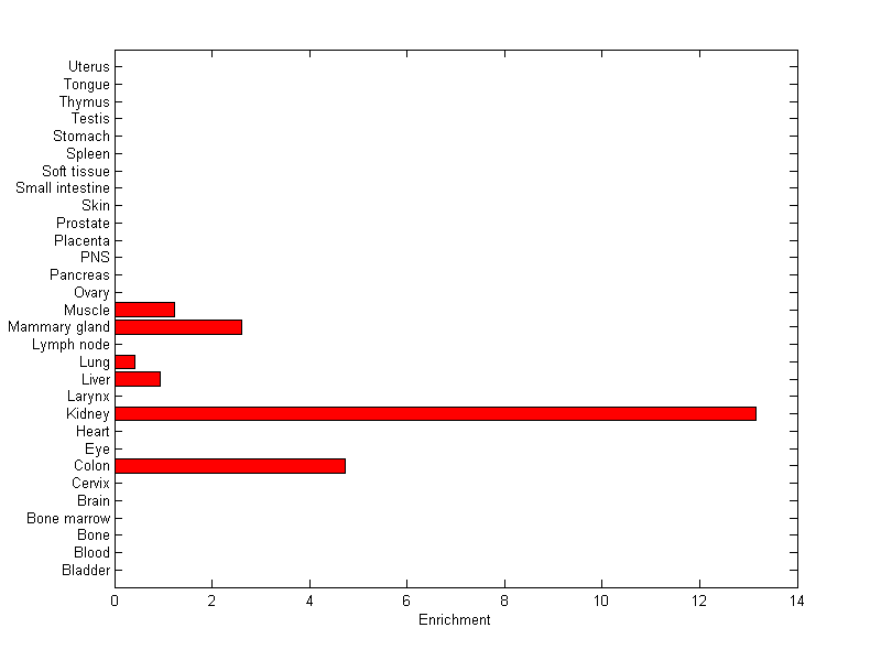 The expression level is normalized with tissue-library size. Each value for a gene in a tissue is a ratio of observed ESTs to the expected one in this tissue. The expected number of ESTs is the product of total ESTs of the gene and the fraction of total ESTs in the tissue among all ESTs in 30 tissues.