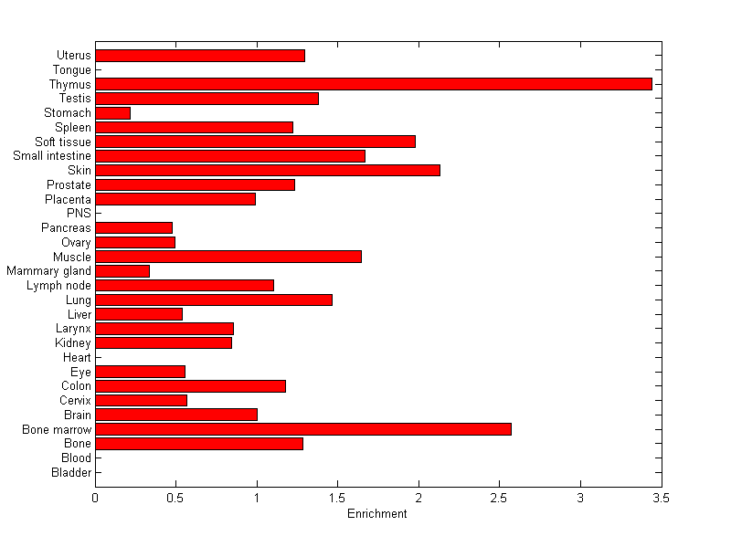 The expression level is normalized with tissue-library size. Each value for a gene in a tissue is a ratio of observed ESTs to the expected one in this tissue. The expected number of ESTs is the product of total ESTs of the gene and the fraction of total ESTs in the tissue among all ESTs in 30 tissues.