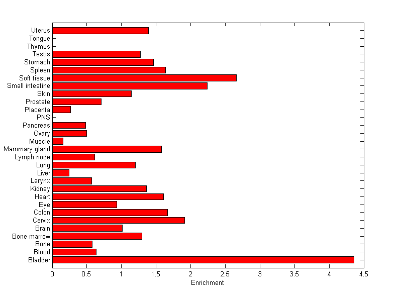 The expression level is normalized with tissue-library size. Each value for a gene in a tissue is a ratio of observed ESTs to the expected one in this tissue. The expected number of ESTs is the product of total ESTs of the gene and the fraction of total ESTs in the tissue among all ESTs in 30 tissues.