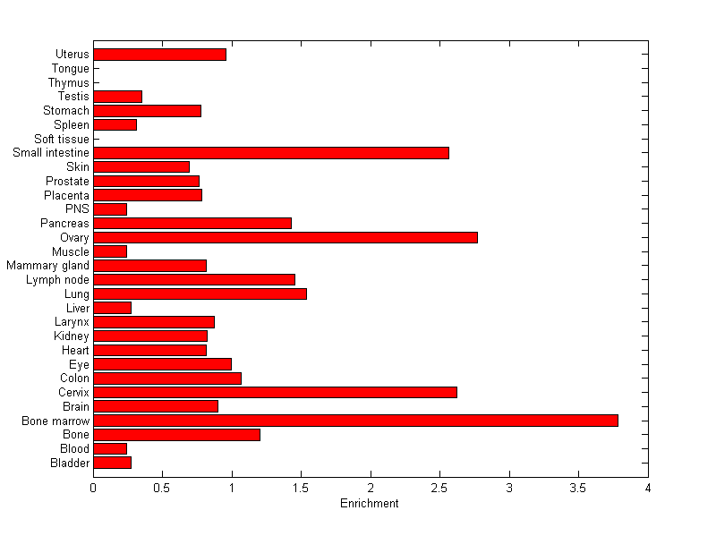 The expression level is normalized with tissue-library size. Each value for a gene in a tissue is a ratio of observed ESTs to the expected one in this tissue. The expected number of ESTs is the product of total ESTs of the gene and the fraction of total ESTs in the tissue among all ESTs in 30 tissues.