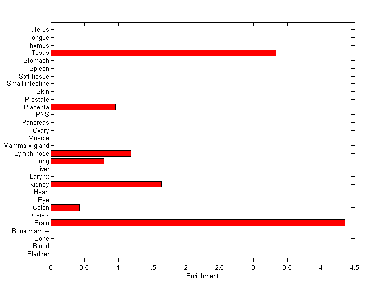 The expression level is normalized with tissue-library size. Each value for a gene in a tissue is a ratio of observed ESTs to the expected one in this tissue. The expected number of ESTs is the product of total ESTs of the gene and the fraction of total ESTs in the tissue among all ESTs in 30 tissues.