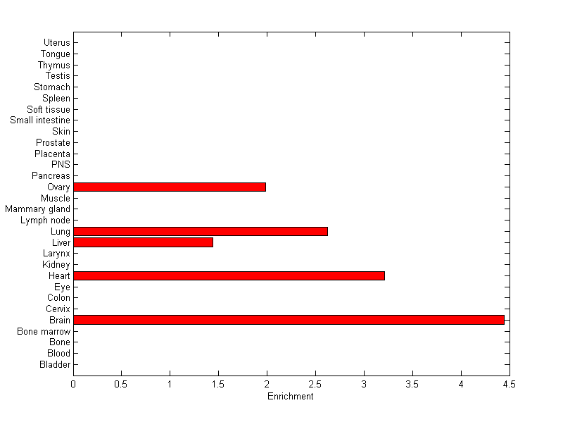 The expression level is normalized with tissue-library size. Each value for a gene in a tissue is a ratio of observed ESTs to the expected one in this tissue. The expected number of ESTs is the product of total ESTs of the gene and the fraction of total ESTs in the tissue among all ESTs in 30 tissues.