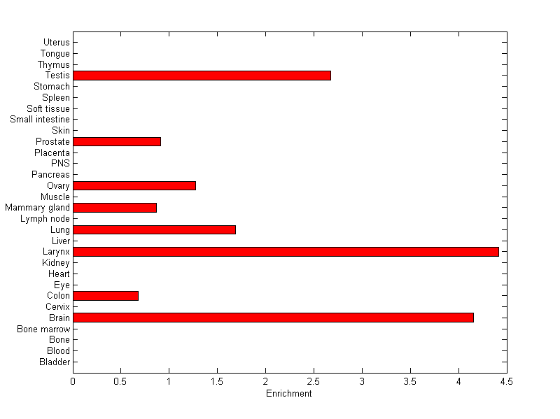 The expression level is normalized with tissue-library size. Each value for a gene in a tissue is a ratio of observed ESTs to the expected one in this tissue. The expected number of ESTs is the product of total ESTs of the gene and the fraction of total ESTs in the tissue among all ESTs in 30 tissues.