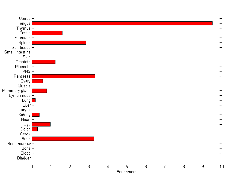 About the profile: The expression level is normalized with tissue-library size. Each value for a gene in a tissue is a ratio of observed ESTs to the expected one in this tissue. The expected number of ESTs is the product of total ESTs of the gene and the fraction of total ESTs in the tissue among all ESTs in 30 tissues. Summary: This gene is preferentially expressed in [tongue] Download: |