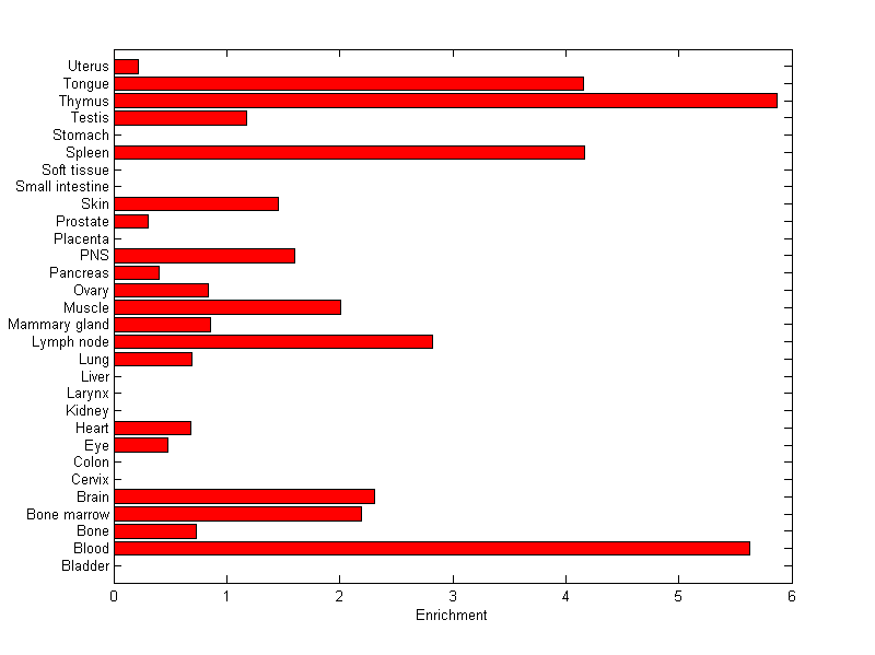 The expression level is normalized with tissue-library size. Each value for a gene in a tissue is a ratio of observed ESTs to the expected one in this tissue. The expected number of ESTs is the product of total ESTs of the gene and the fraction of total ESTs in the tissue among all ESTs in 30 tissues.