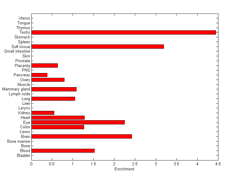 The expression level is normalized with tissue-library size. Each value for a gene in a tissue is a ratio of observed ESTs to the expected one in this tissue. The expected number of ESTs is the product of total ESTs of the gene and the fraction of total ESTs in the tissue among all ESTs in 30 tissues.