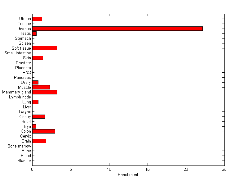 The expression level is normalized with tissue-library size. Each value for a gene in a tissue is a ratio of observed ESTs to the expected one in this tissue. The expected number of ESTs is the product of total ESTs of the gene and the fraction of total ESTs in the tissue among all ESTs in 30 tissues.