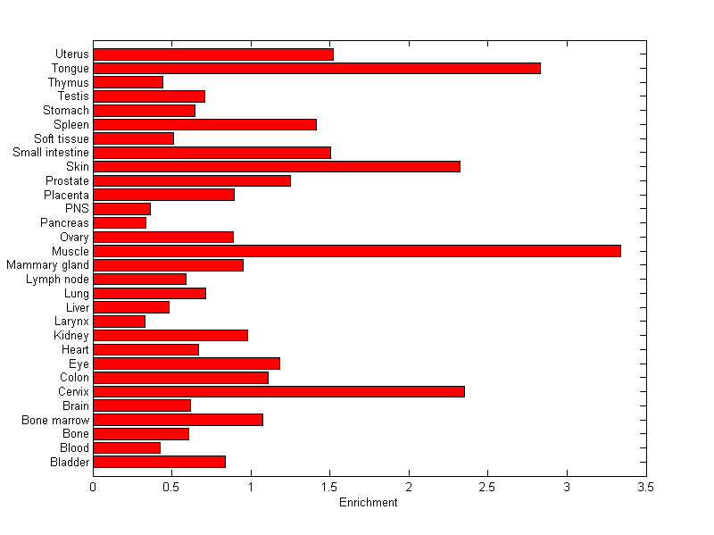 The expression level is normalized with tissue-library size. Each value for a gene in a tissue is a ratio of observed ESTs to the expected one in this tissue. The expected number of ESTs is the product of total ESTs of the gene and the fraction of total ESTs in the tissue among all ESTs in 30 tissues.