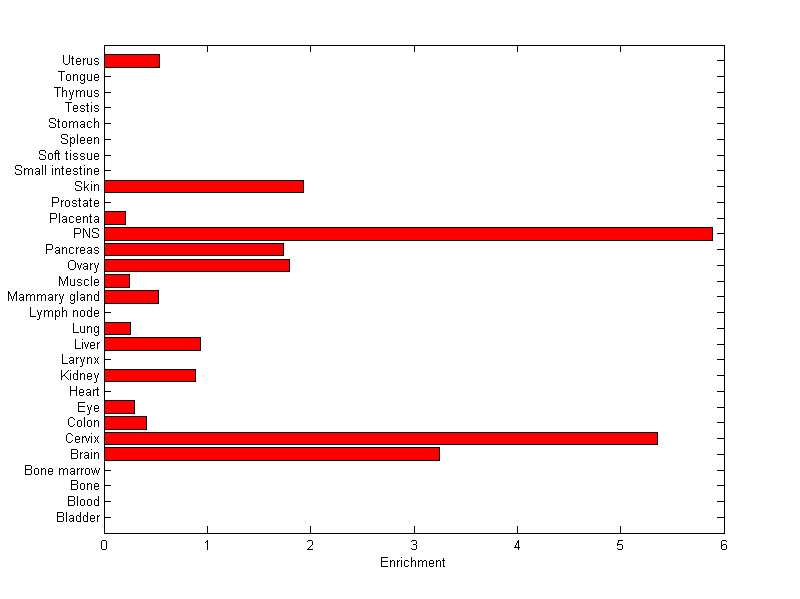 The expression level is normalized with tissue-library size. Each value for a gene in a tissue is a ratio of observed ESTs to the expected one in this tissue. The expected number of ESTs is the product of total ESTs of the gene and the fraction of total ESTs in the tissue among all ESTs in 30 tissues.