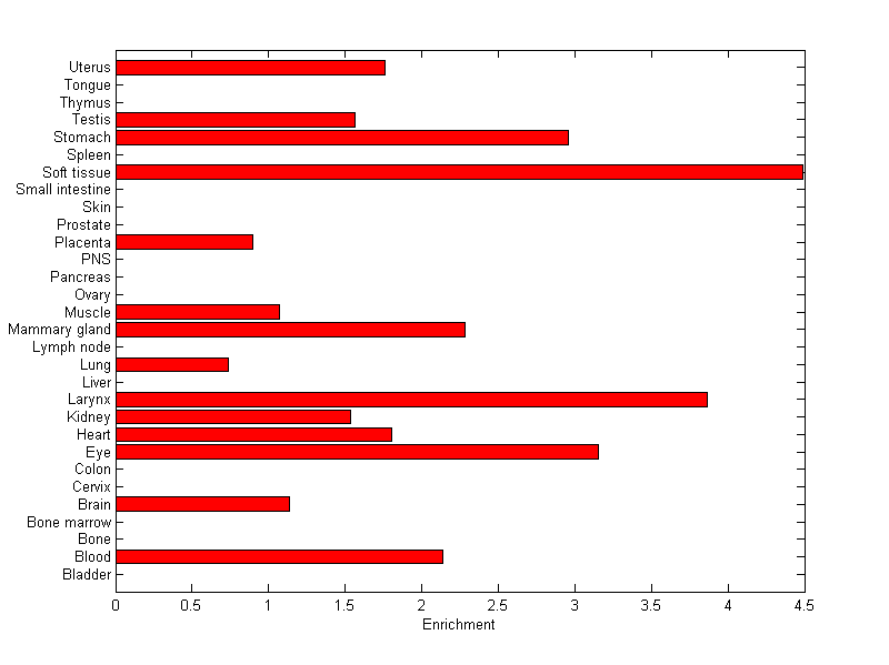 The expression level is normalized with tissue-library size. Each value for a gene in a tissue is a ratio of observed ESTs to the expected one in this tissue. The expected number of ESTs is the product of total ESTs of the gene and the fraction of total ESTs in the tissue among all ESTs in 30 tissues.