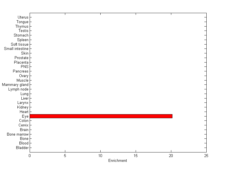 The expression level is normalized with tissue-library size. Each value for a gene in a tissue is a ratio of observed ESTs to the expected one in this tissue. The expected number of ESTs is the product of total ESTs of the gene and the fraction of total ESTs in the tissue among all ESTs in 30 tissues.