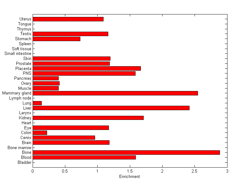 The expression level is normalized with tissue-library size. Each value for a gene in a tissue is a ratio of observed ESTs to the expected one in this tissue. The expected number of ESTs is the product of total ESTs of the gene and the fraction of total ESTs in the tissue among all ESTs in 30 tissues.