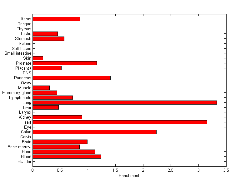 The expression level is normalized with tissue-library size. Each value for a gene in a tissue is a ratio of observed ESTs to the expected one in this tissue. The expected number of ESTs is the product of total ESTs of the gene and the fraction of total ESTs in the tissue among all ESTs in 30 tissues.