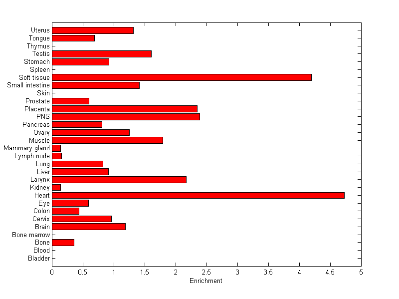 The expression level is normalized with tissue-library size. Each value for a gene in a tissue is a ratio of observed ESTs to the expected one in this tissue. The expected number of ESTs is the product of total ESTs of the gene and the fraction of total ESTs in the tissue among all ESTs in 30 tissues.
