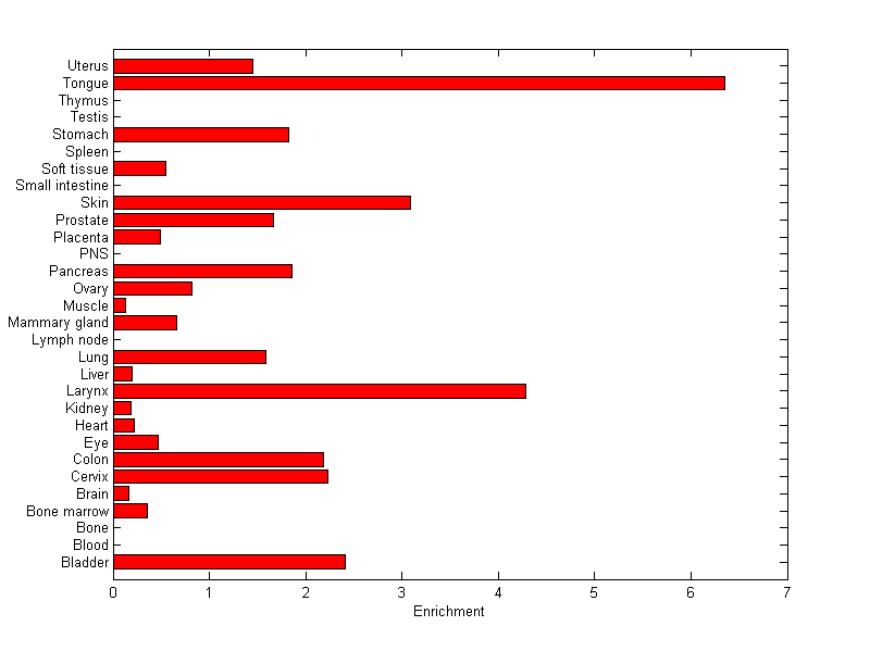 The expression level is normalized with tissue-library size. Each value for a gene in a tissue is a ratio of observed ESTs to the expected one in this tissue. The expected number of ESTs is the product of total ESTs of the gene and the fraction of total ESTs in the tissue among all ESTs in 30 tissues.