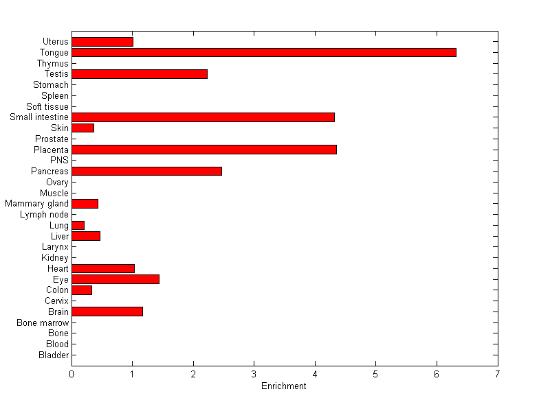 The expression level is normalized with tissue-library size. Each value for a gene in a tissue is a ratio of observed ESTs to the expected one in this tissue. The expected number of ESTs is the product of total ESTs of the gene and the fraction of total ESTs in the tissue among all ESTs in 30 tissues.