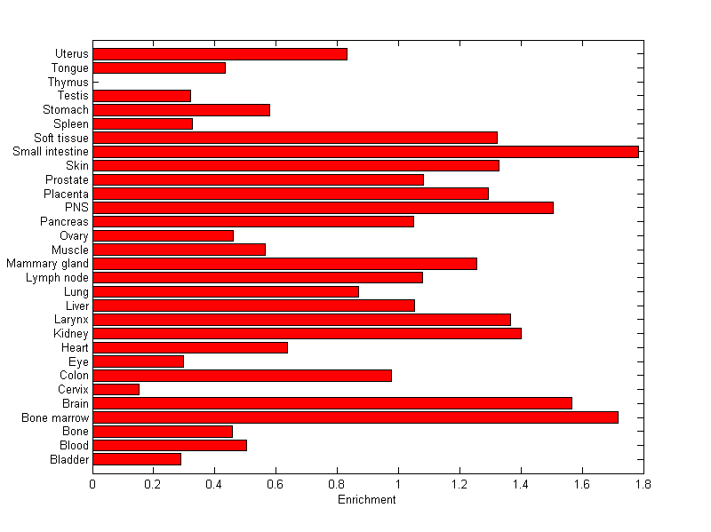 The expression level is normalized with tissue-library size. Each value for a gene in a tissue is a ratio of observed ESTs to the expected one in this tissue. The expected number of ESTs is the product of total ESTs of the gene and the fraction of total ESTs in the tissue among all ESTs in 30 tissues.