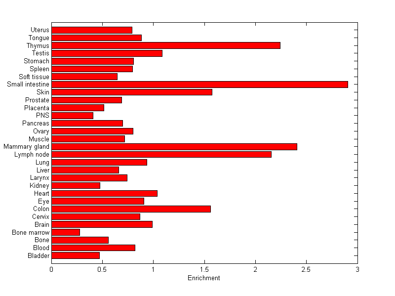 The expression level is normalized with tissue-library size. Each value for a gene in a tissue is a ratio of observed ESTs to the expected one in this tissue. The expected number of ESTs is the product of total ESTs of the gene and the fraction of total ESTs in the tissue among all ESTs in 30 tissues.