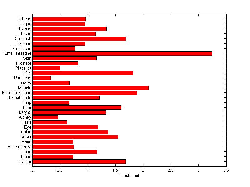 The expression level is normalized with tissue-library size. Each value for a gene in a tissue is a ratio of observed ESTs to the expected one in this tissue. The expected number of ESTs is the product of total ESTs of the gene and the fraction of total ESTs in the tissue among all ESTs in 30 tissues.