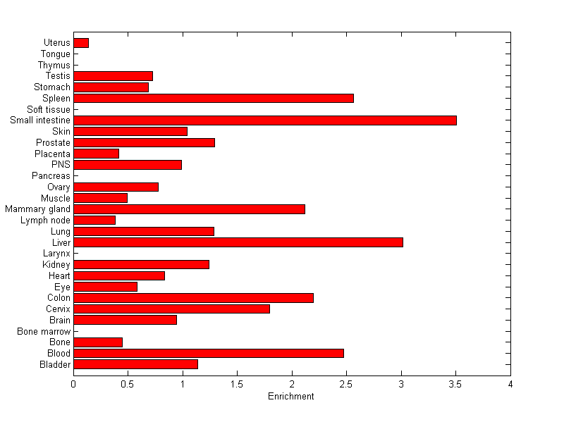 The expression level is normalized with tissue-library size. Each value for a gene in a tissue is a ratio of observed ESTs to the expected one in this tissue. The expected number of ESTs is the product of total ESTs of the gene and the fraction of total ESTs in the tissue among all ESTs in 30 tissues.