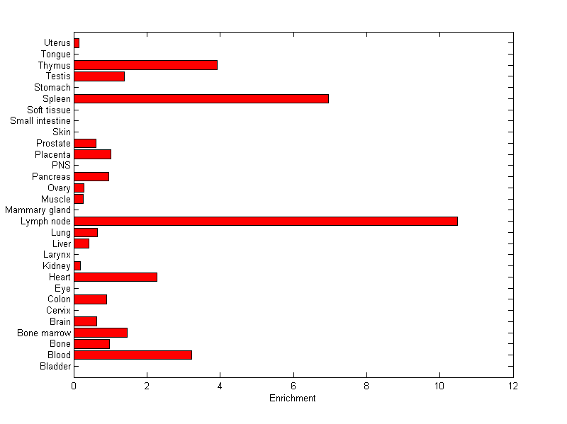 The expression level is normalized with tissue-library size. Each value for a gene in a tissue is a ratio of observed ESTs to the expected one in this tissue. The expected number of ESTs is the product of total ESTs of the gene and the fraction of total ESTs in the tissue among all ESTs in 30 tissues.