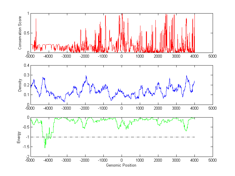 The energy profile (green curve) is about energy for module detection based on TF interaction. The positions with energy less than -1 indicate the existence of CRMs.