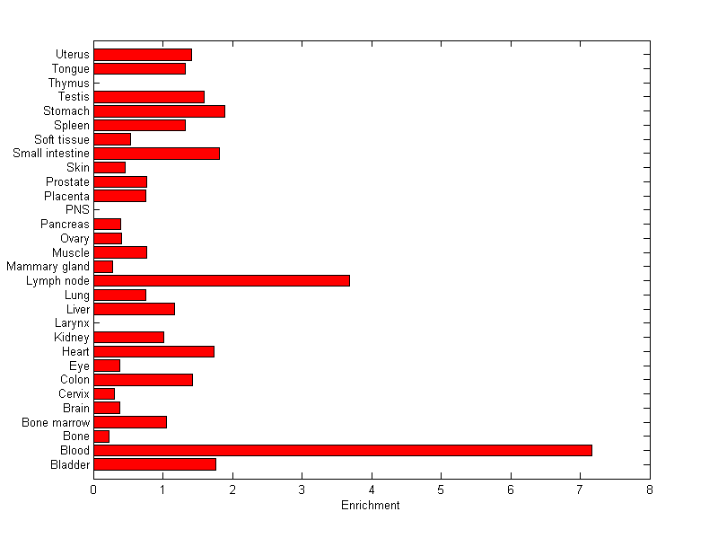 The expression level is normalized with tissue-library size. Each value for a gene in a tissue is a ratio of observed ESTs to the expected one in this tissue. The expected number of ESTs is the product of total ESTs of the gene and the fraction of total ESTs in the tissue among all ESTs in 30 tissues.