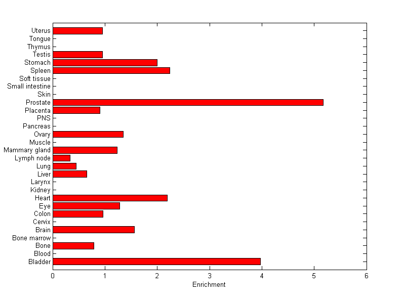 About the profile: The expression level is normalized with tissue-library size. Each value for a gene in a tissue is a ratio of observed ESTs to the expected one in this tissue. The expected number of ESTs is the product of total ESTs of the gene and the fraction of total ESTs in the tissue among all ESTs in 30 tissues. Summary: This gene is preferentially expressed in [prostate] Download: |