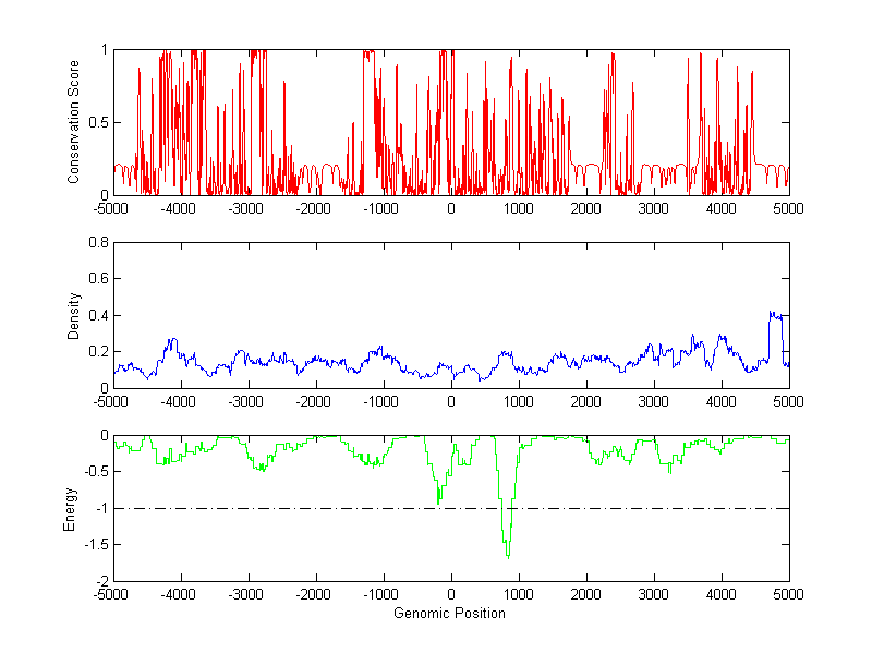 About the profiles: The conservation profile (red curve) is about conservation scores of the promoter sequences. Conservation was determined from an eight-way alignment of human, chimpanzee, dog, mouse, rat, chicken, zebrafish and fugu sequences. The conservation was quantified by a conservation score between 0 and 1, with 1 as highest conservation. The conservation score was obtained from UCSC genome databases. The density profile (blue curve) is about density of all TF binding sites. The energy profile (green curve) is about energy for module detection based on TF interaction. The positions with energy less than -1 indicate the existence of CRMs. Download: Conservation profileDensity profile Energy profile CRM summary |