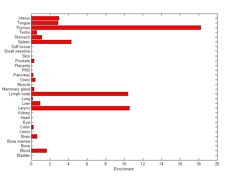 About the profile: The expression level is normalized with tissue-library size. Each value for a gene in a tissue is a ratio of observed ESTs to the expected one in this tissue. The expected number of ESTs is the product of total ESTs of the gene and the fraction of total ESTs in the tissue among all ESTs in 30 tissues. Summary: This gene is preferentially expressed in [larynx, lymph_node] Download: |