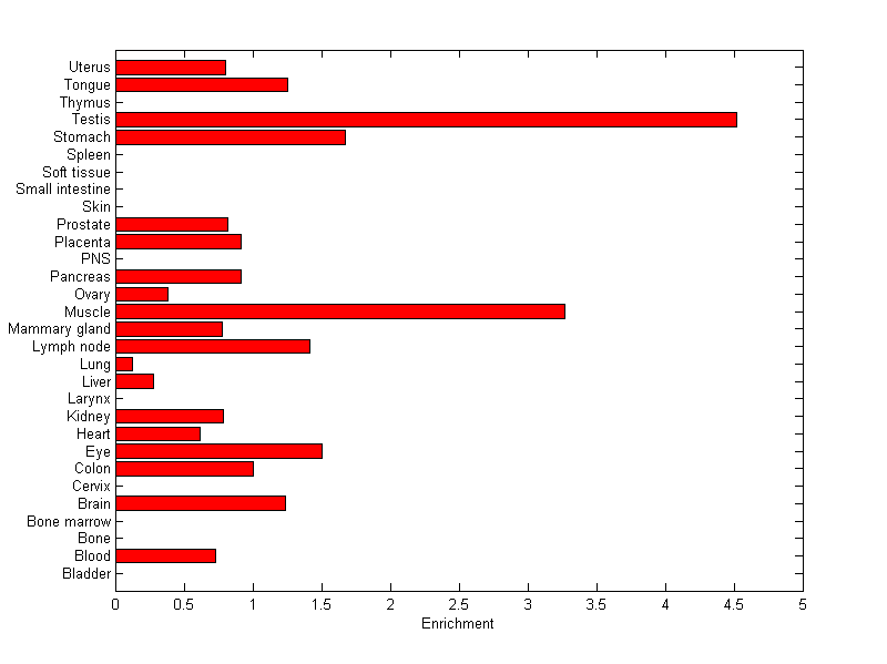 The expression level is normalized with tissue-library size. Each value for a gene in a tissue is a ratio of observed ESTs to the expected one in this tissue. The expected number of ESTs is the product of total ESTs of the gene and the fraction of total ESTs in the tissue among all ESTs in 30 tissues.