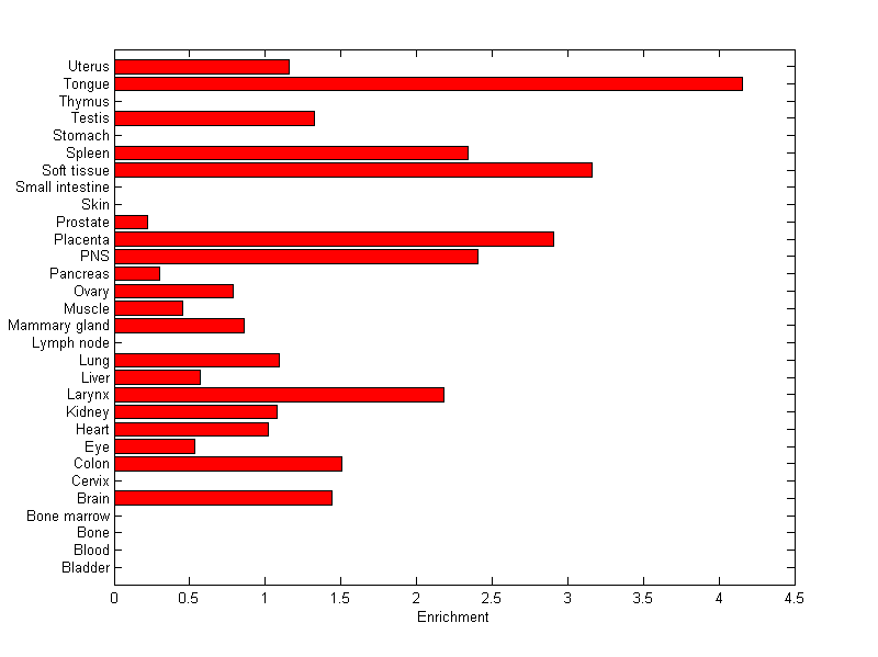 The expression level is normalized with tissue-library size. Each value for a gene in a tissue is a ratio of observed ESTs to the expected one in this tissue. The expected number of ESTs is the product of total ESTs of the gene and the fraction of total ESTs in the tissue among all ESTs in 30 tissues.