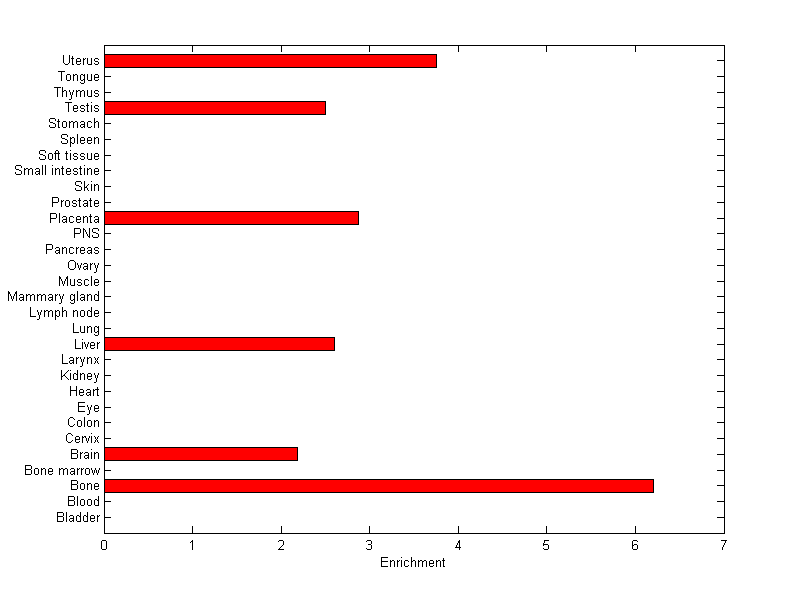 The expression level is normalized with tissue-library size. Each value for a gene in a tissue is a ratio of observed ESTs to the expected one in this tissue. The expected number of ESTs is the product of total ESTs of the gene and the fraction of total ESTs in the tissue among all ESTs in 30 tissues.
