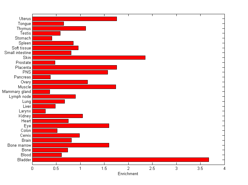 The expression level is normalized with tissue-library size. Each value for a gene in a tissue is a ratio of observed ESTs to the expected one in this tissue. The expected number of ESTs is the product of total ESTs of the gene and the fraction of total ESTs in the tissue among all ESTs in 30 tissues.