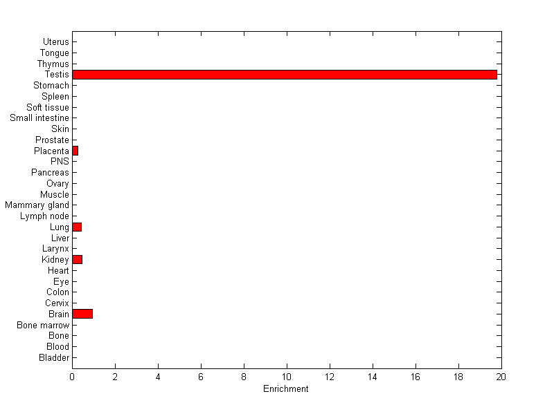 The expression level is normalized with tissue-library size. Each value for a gene in a tissue is a ratio of observed ESTs to the expected one in this tissue. The expected number of ESTs is the product of total ESTs of the gene and the fraction of total ESTs in the tissue among all ESTs in 30 tissues.