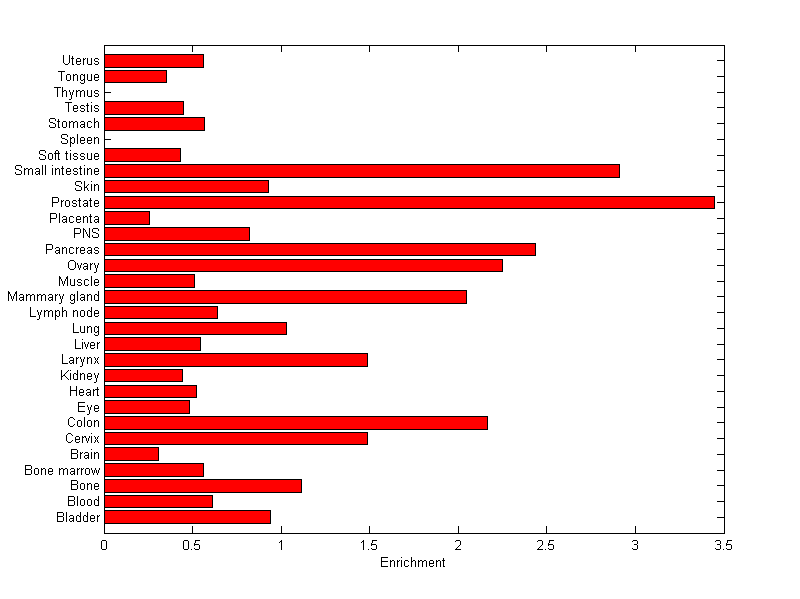 The expression level is normalized with tissue-library size. Each value for a gene in a tissue is a ratio of observed ESTs to the expected one in this tissue. The expected number of ESTs is the product of total ESTs of the gene and the fraction of total ESTs in the tissue among all ESTs in 30 tissues.