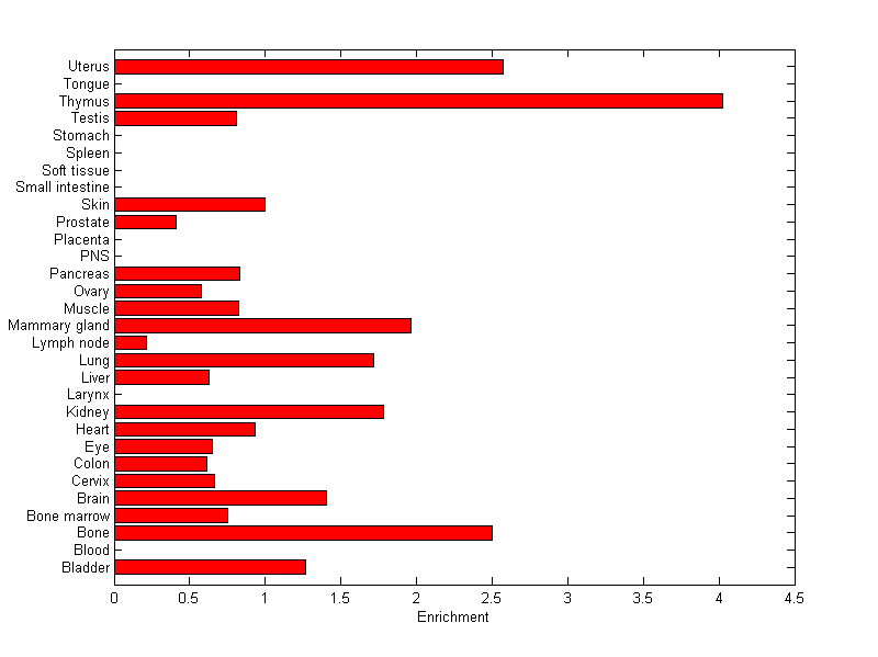 The expression level is normalized with tissue-library size. Each value for a gene in a tissue is a ratio of observed ESTs to the expected one in this tissue. The expected number of ESTs is the product of total ESTs of the gene and the fraction of total ESTs in the tissue among all ESTs in 30 tissues.
