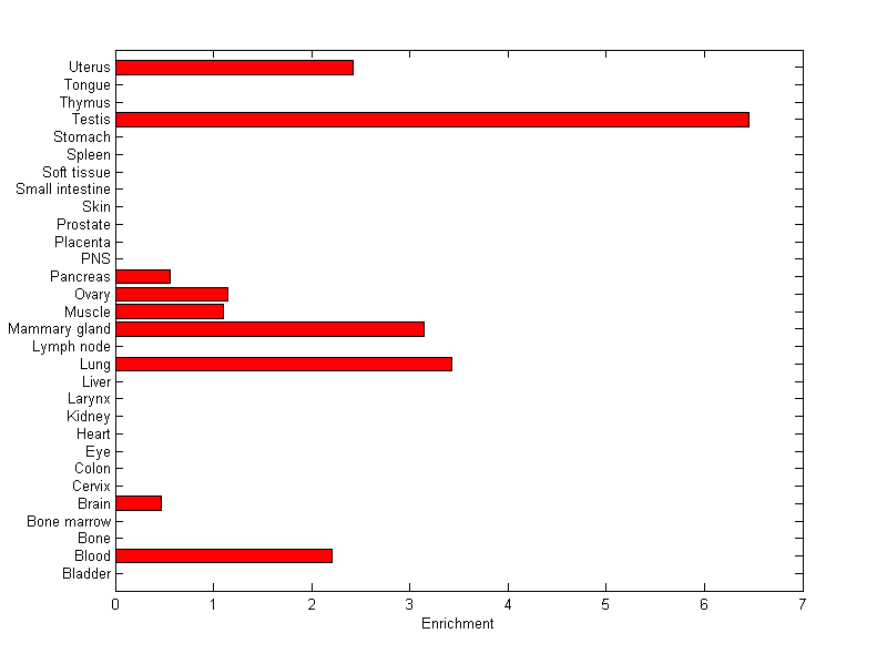 The expression level is normalized with tissue-library size. Each value for a gene in a tissue is a ratio of observed ESTs to the expected one in this tissue. The expected number of ESTs is the product of total ESTs of the gene and the fraction of total ESTs in the tissue among all ESTs in 30 tissues.