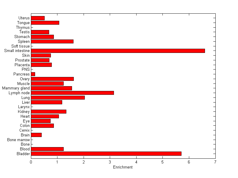 The expression level is normalized with tissue-library size. Each value for a gene in a tissue is a ratio of observed ESTs to the expected one in this tissue. The expected number of ESTs is the product of total ESTs of the gene and the fraction of total ESTs in the tissue among all ESTs in 30 tissues.
