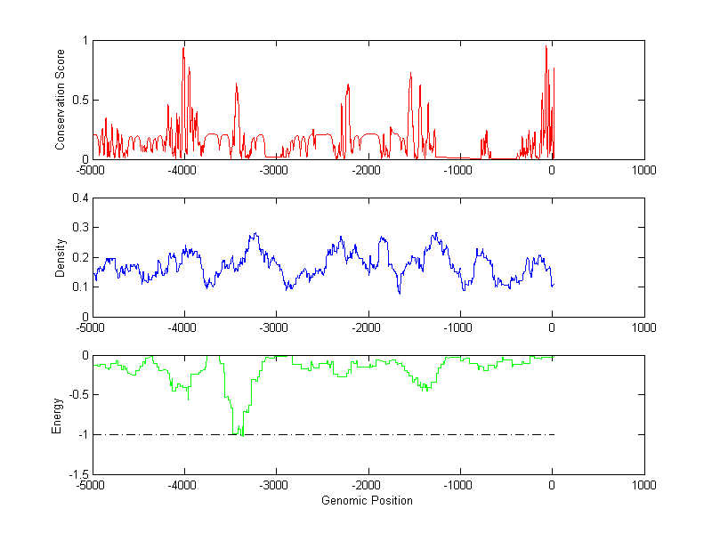 The energy profile (green curve) is about energy for module detection based on TF interaction. The positions with energy less than -1 indicate the existence of CRMs.