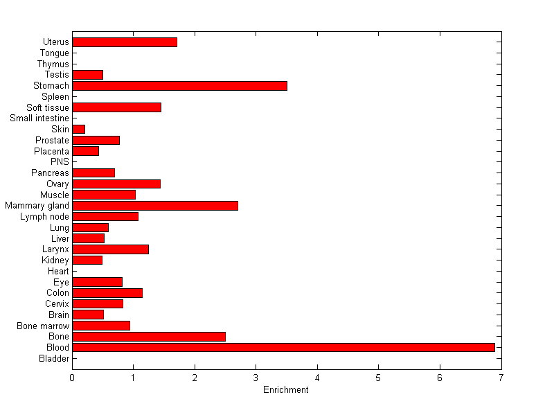 The expression level is normalized with tissue-library size. Each value for a gene in a tissue is a ratio of observed ESTs to the expected one in this tissue. The expected number of ESTs is the product of total ESTs of the gene and the fraction of total ESTs in the tissue among all ESTs in 30 tissues.