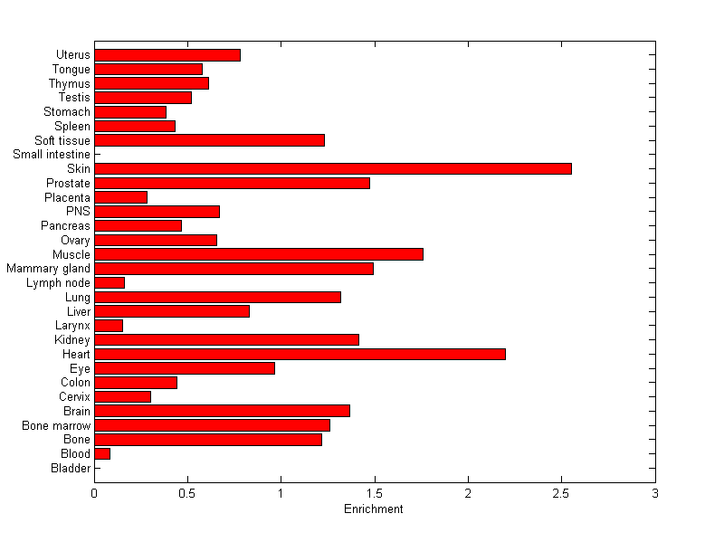The expression level is normalized with tissue-library size. Each value for a gene in a tissue is a ratio of observed ESTs to the expected one in this tissue. The expected number of ESTs is the product of total ESTs of the gene and the fraction of total ESTs in the tissue among all ESTs in 30 tissues.
