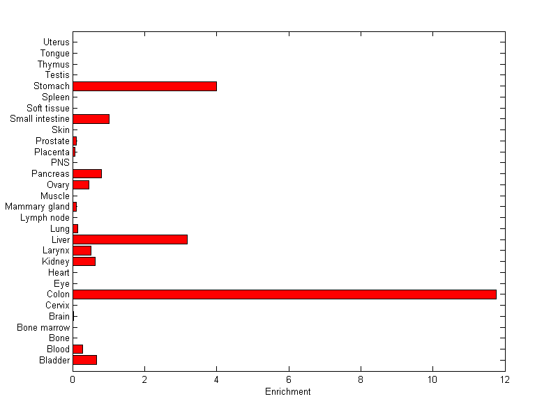 The expression level is normalized with tissue-library size. Each value for a gene in a tissue is a ratio of observed ESTs to the expected one in this tissue. The expected number of ESTs is the product of total ESTs of the gene and the fraction of total ESTs in the tissue among all ESTs in 30 tissues.