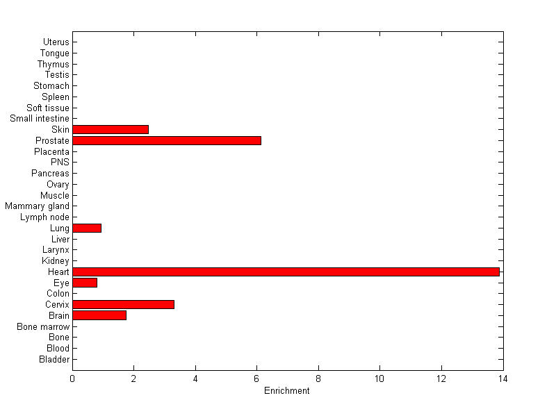 The expression level is normalized with tissue-library size. Each value for a gene in a tissue is a ratio of observed ESTs to the expected one in this tissue. The expected number of ESTs is the product of total ESTs of the gene and the fraction of total ESTs in the tissue among all ESTs in 30 tissues.