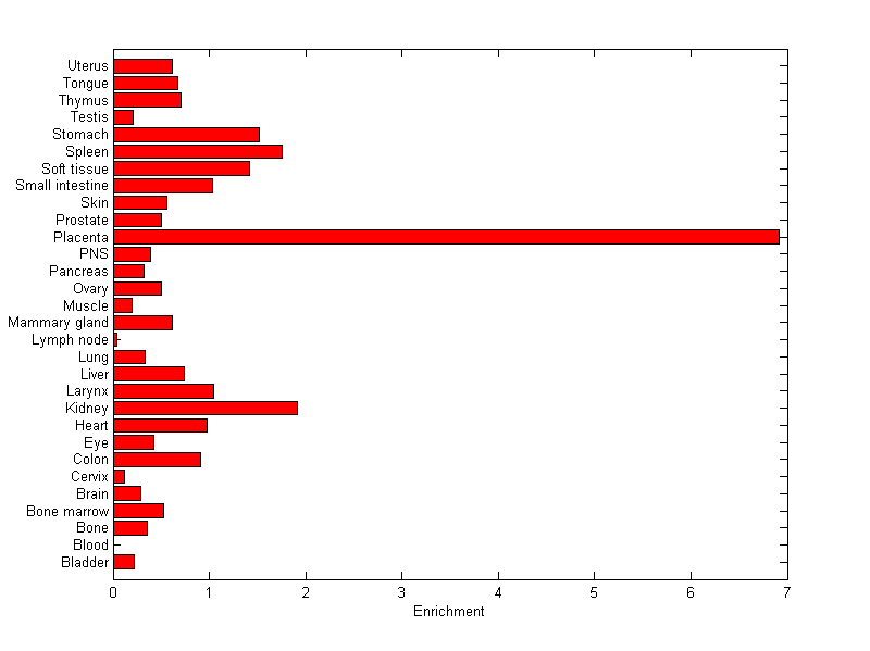 The expression level is normalized with tissue-library size. Each value for a gene in a tissue is a ratio of observed ESTs to the expected one in this tissue. The expected number of ESTs is the product of total ESTs of the gene and the fraction of total ESTs in the tissue among all ESTs in 30 tissues.